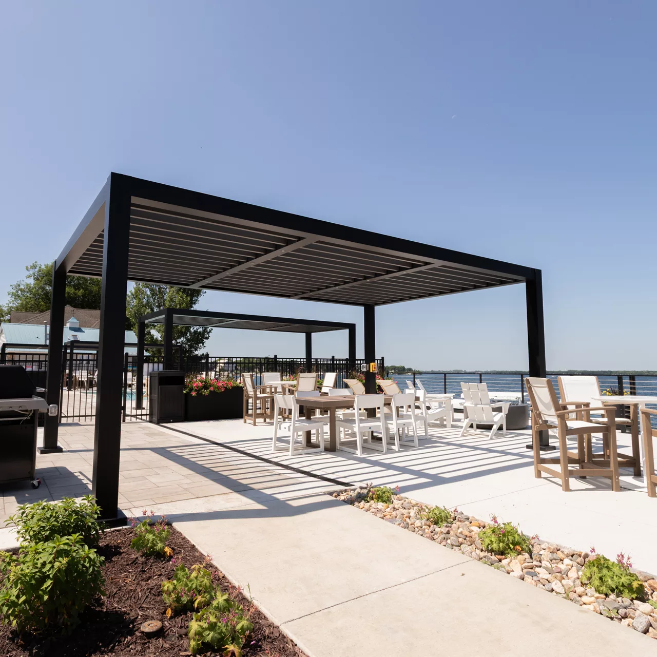 The R-BREEZE™ Pergola features fixed louvers angled at 55° or set vertically at 90°, providing the perfect blend of sun and shade. Our team can design and install a pergola tailored to your commercial needs, blending seamlessly with any architectural style.